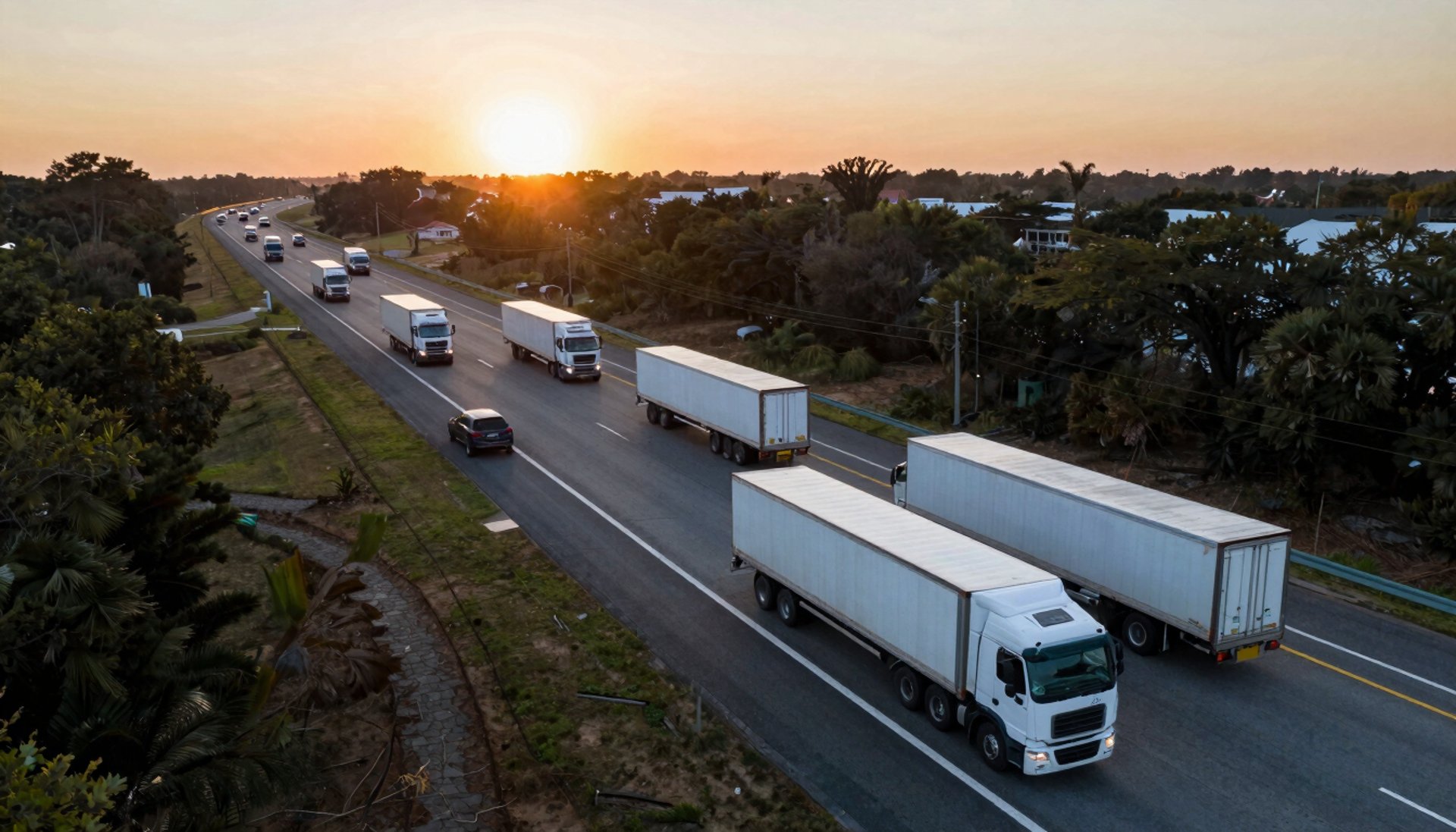 A professional truck dispatcher in a high-tech North American office setting working at a multi-monitor desk showing logistics maps, clean and modern aesthetic, charcoal grey and soft white lighting.